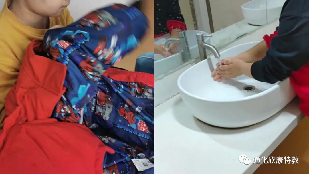 穿衣-辨别衣服正反面;洗手-发现手脏了、找到水龙头。