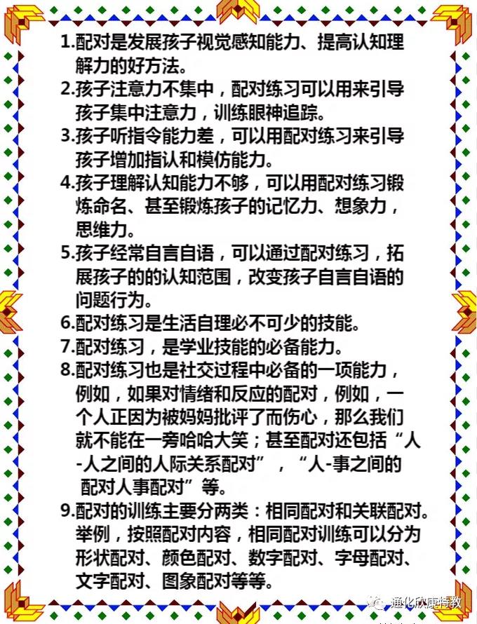 配对是发展孩子视觉感知能力、提高认知水平很好的方法之一,在干预训练中有着不可替代的重要性,它的主要目的是提高对视觉刺激、加以辨别以及分析的技能,这种技能关系到孩子每天的活动,配对练习是自闭症孩子康复训练中一个较为常见的训练项目,对自闭症孩子的认知能力提升以及锻炼视觉思维技能具有很大的帮助。