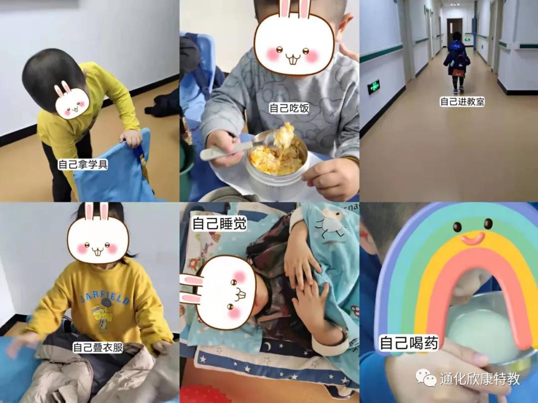 很多孤独症儿童在学习基本的生活自理技能方面都有困难,在像穿衣服、吃饭等适当的社会行为方面往往大部分需要成人的帮助。 特殊儿童家庭对孩子有不同的寄望,大多还是希望他们能做到知事懂情、生活自理,可实际情况却会因为对孩子的过度关怀、照顾的辅助替代程度、观念的不同而让孩子在饮食、如厕、穿衣、整理、喝水等诸多方面都不能达到自理的程度,比如不提示不会主动去卫生间如厕、小解不会脱裤子、自己不会吃饭需要喂、不会整理自己的物品归位、穿衣服穿鞋习惯性等待大人的帮忙、拉锁塞不进锁扣里、吃水果淌汁水不知道擦、不会洗脸刷牙……然而,在科学的训练和细心的关怀下,大多数孤独症儿童都能够学会相当复杂的自我帮助性技能,但家长并没有意识地加以训练,致使自己成为孩子永久性的生活保姆,这是最令家长痛心的,也是家长最不希望的,更是老师最大的担心。 让特殊孩子从点滴开始,由家长老师的辅助引导到独立主动完成是欣康特教一直以来遵循的目标和原则,过程困难而漫长却会有收获,家长一定要做到忍住嘴、管住手,为孩子着想,放手很难,却会带来美好。